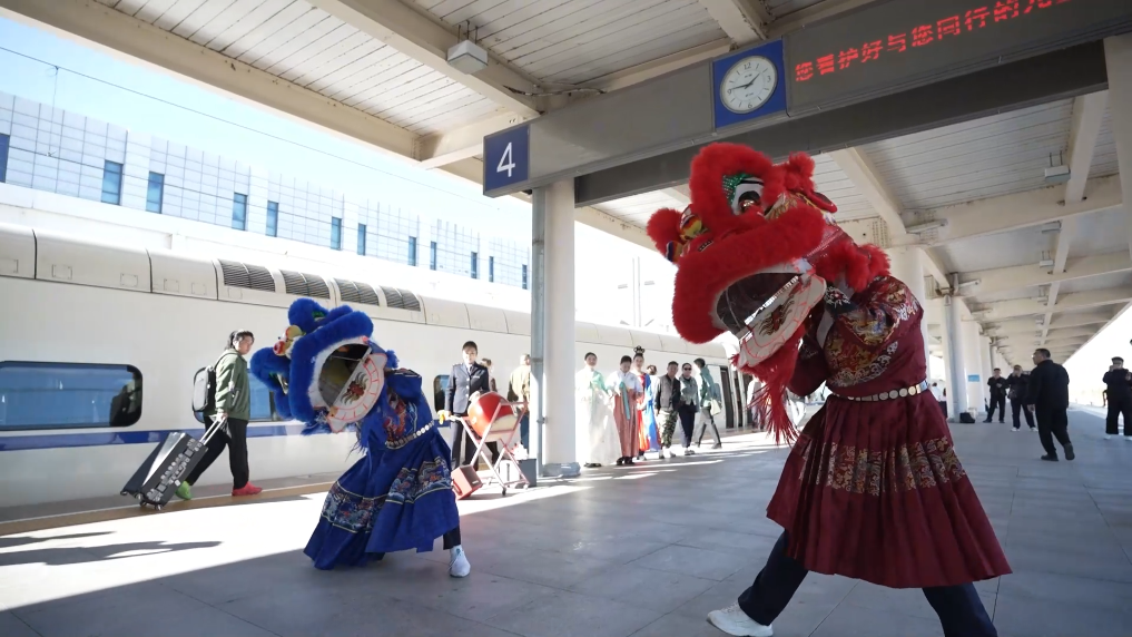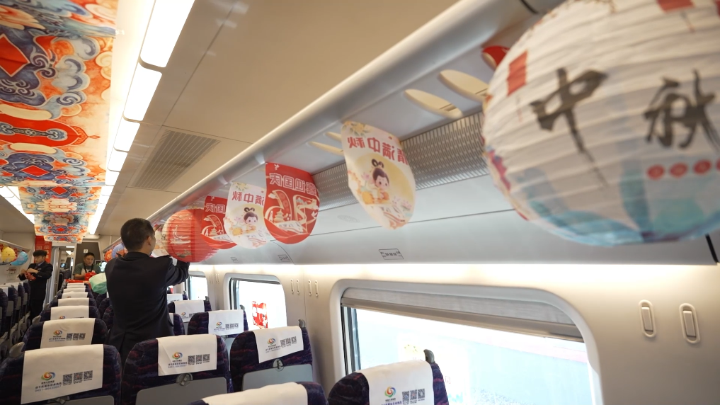 工作人員用月亮燈、玉兔彩帶和彩繪燈籠將車廂裝扮得溫馨熱鬧,乘務人員身著傳統服飾與旅客們互動。