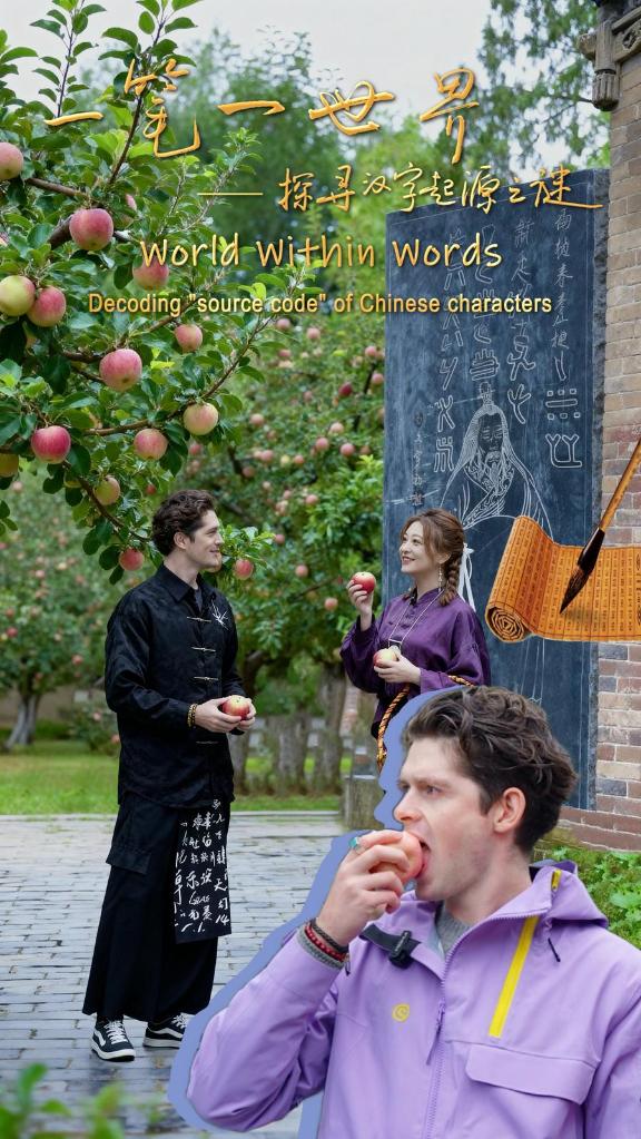 在新華社記者高尚的引導下,英國旅游博主亞當來到倉頡廟,開啟了一次“倉頡造字”的探索之旅。