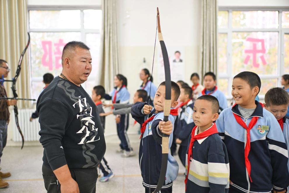 在新疆伊寧市第二十五小學,吳俊亮(左一)指導射箭社團學生練習傳統弓(10月23日攝)。新華社記者 胡虎虎 攝