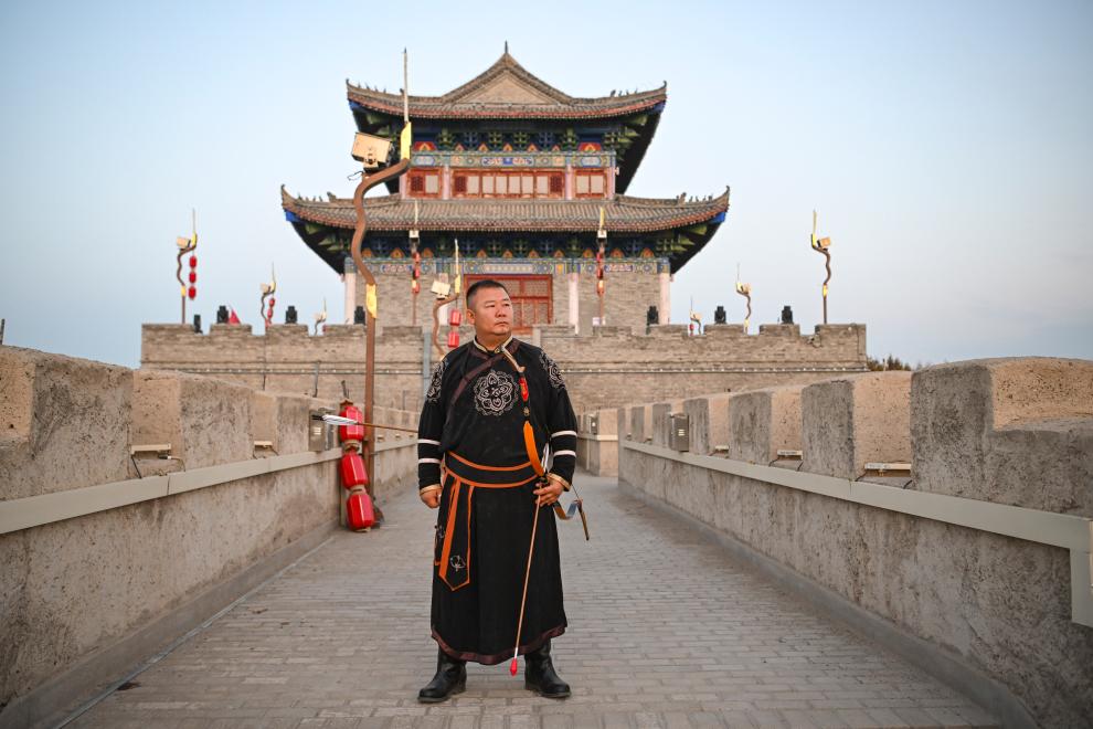 吳俊亮手持弓箭在察布查爾錫伯自治縣錫伯古城景區城墻上(10月24日攝)。新華社記者 胡虎虎 攝