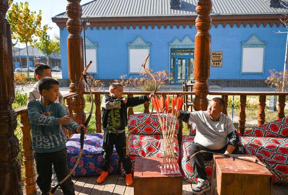 借著非遺文旅熱潮,今年初,吳俊亮在伊犁老城文化旅游區開辦了一家射箭館,主推傳統弓箭文化。這在該旅游區的20多家非遺店鋪中獨樹一幟。