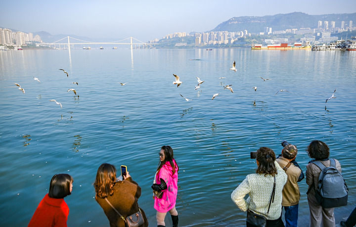 2024年11月29日,市民和游客在重慶萬州十七碼頭觀賞紅嘴鷗。(付作僑 攝)