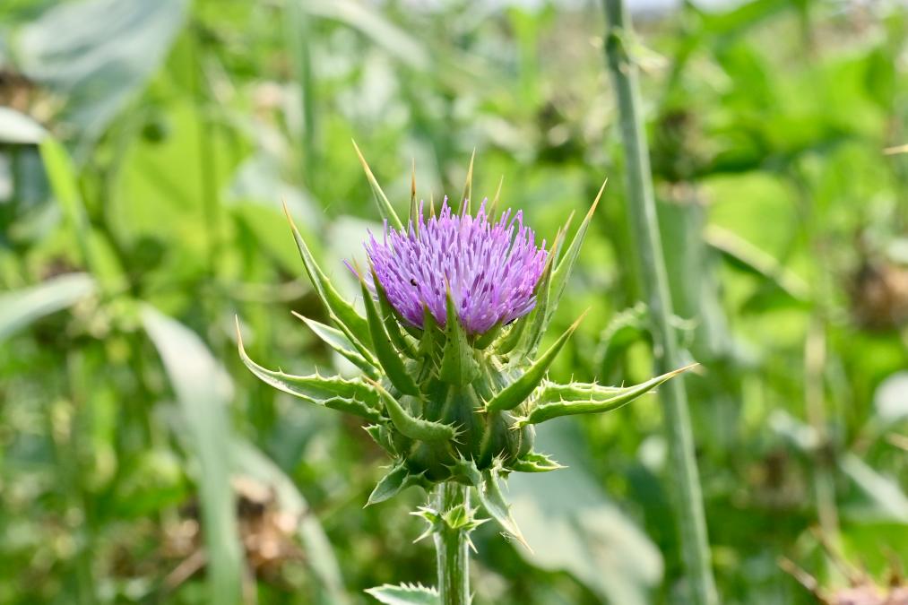 盤錦的鄉野間,每年5月至6月,成片的水飛薊綻放出紫艷艷的花球,與紅色堿蓬草、金色稻穗相映成趣,成了濕地城市里一道獨特的風景。