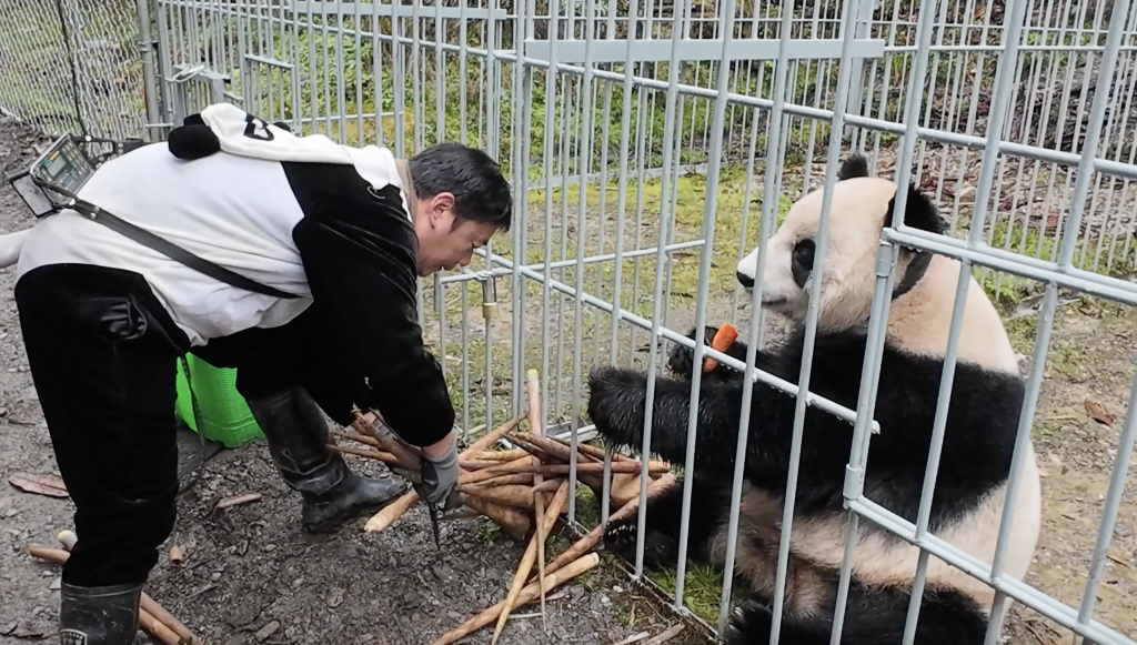 11月12日,劉曉強正在為大熊貓“灰灰”加餐。新華社記者 趙怡寧 攝