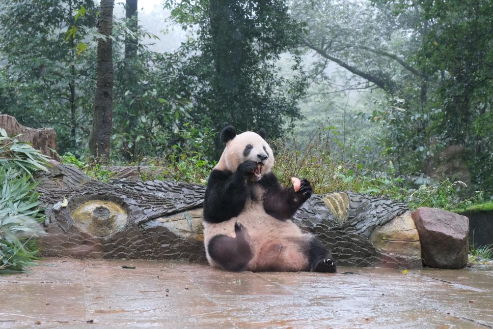 11月5日,大熊貓“香香”正在吃蘋果。新華社記者 邊思琪 攝