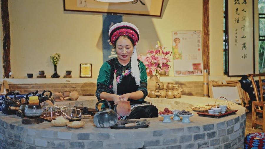 11月20日,董麗正在沖泡白族三道茶。新華社記者 丁怡全 攝
