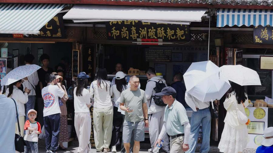 7月2日,杜方明家的喜洲粑粑店外,消費者排隊等候。新華社記者丁怡全 攝
