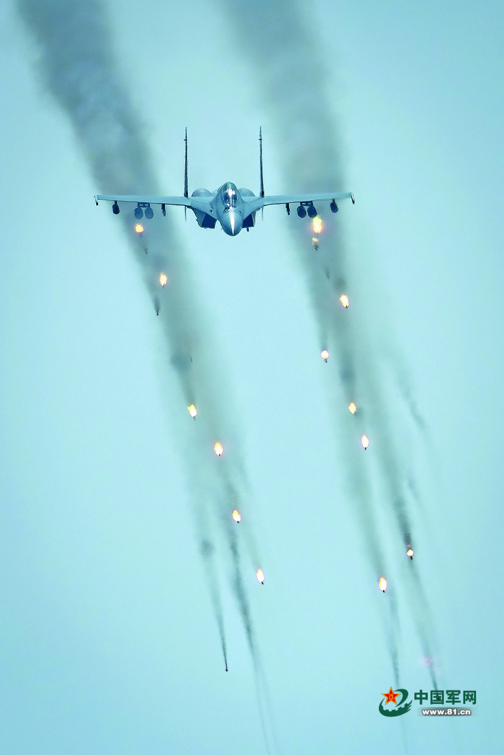 飛行途中,空中預警機向戰機編隊不停分發空中態勢。突然,數個可疑目標高速接近?!氨3志?,梯次攔截!”長機下達指令。確認“敵機”企圖后,長機立即大坡度機動,切入其航線,形成有效驅離態勢。