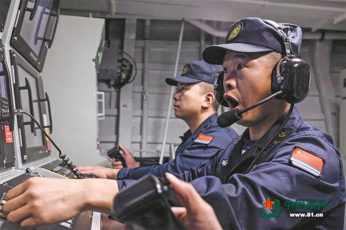 “戰斗警報!”機動途中,“敵情”突發。艦艇雷達立即展開搜索,實時將目標信息傳輸至各作戰單元。某護衛艦雷達率先發現目標。作戰指揮室內,各戰位人員迅速解算射擊諸元,口令聲、鍵盤敲擊聲此起彼伏。編隊指揮員命令各艦調整陣位,組成對空防御陣形,做好戰斗準備。