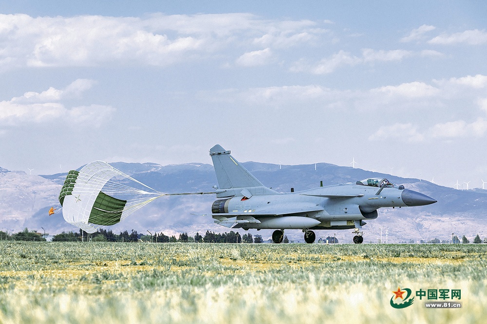 訓練持續至正午,跑道上熱浪蒸騰。戰機返航,主輪觸地滑跑,機尾傘艙“嘭”地彈出阻力傘,白綠相間的傘衣在氣流中急速綻放,拖拽著疾速滑行的戰機慢慢減速。