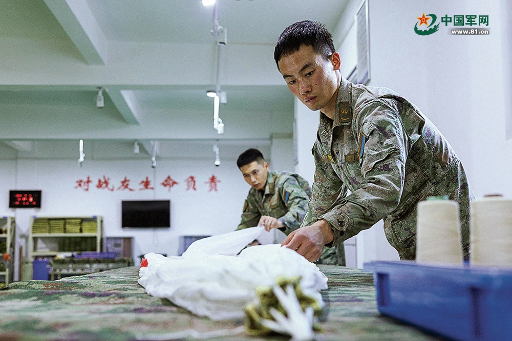 檢查、整理、折疊、封包……夕陽西下,救生裝具員們一絲不茍地在作業。他們身后的貨架上,傘具整齊碼放,如同列隊士兵等待再次出征。(譚斌 蔡尚洋 李迎攝影報道)