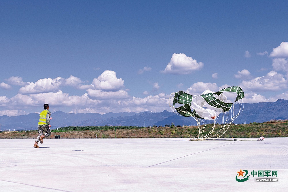 阻力傘脫落后,救生裝具員快速跑去撿傘。