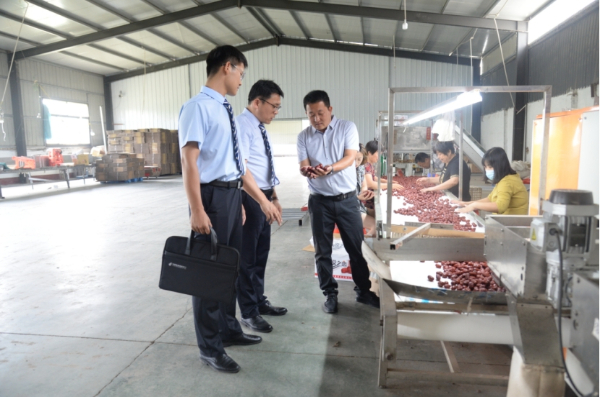 郵儲銀行客戶經理走訪企業生產車間,了解紅棗分揀情況。