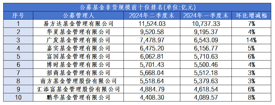 Wind數據顯示,截至6月30日,公募機構非貨基金規模排在行業前10的基金公司依次是:易方達基金、華夏基金、廣發基金、嘉實基金、富國基金、博時基金、招商基金、南方基金、匯添富基金、鵬華基金。其中,廣發基金的資產規模較一季度末增加了1086億元,環比增幅為14%,規模增長較快;易方達基金、富國基金、鵬華基金分別增加了787億元、714億元、701億元;華夏基金、南方基金、博時基金、匯添富基金的規模增長也超過500億元。