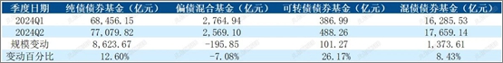 根據基金二級分類的分項來看,純債債券基金、混債債券基金和可轉債債券基金管理規模均有所上升,偏債混合基金管理規模有所下降。純債債券基金資產凈值2024年二季度相比上一季度合計上升8623.67億元,升幅約12.60%??赊D債債券基金規模上升相對幅度較大,升幅約為26.17%。偏債混合基金2024年二季度基金資產凈值相比上一季度合計下降195.84億元,降幅約為7.08%。