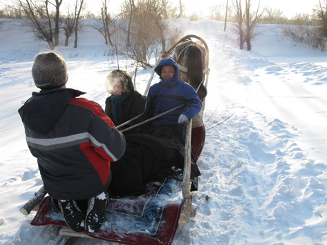 楊文清及同事坐著馬拉爬犁開展貸款調查
