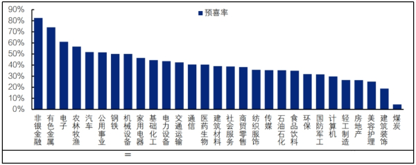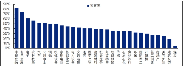 據研報顯示,從披露率高于20%的申萬二級行業來看,已披露預告的行業預喜率方面,貴金屬(100%)、航海裝備(100%)、證券(100%)、小金屬(90.0%)、其他電子(88.9%)、漁業(75.0%)、軌交設備(71.4%)、家電零部件(70.0%)、工業金屬(69.6%)和元件(69.2%)位列前十。