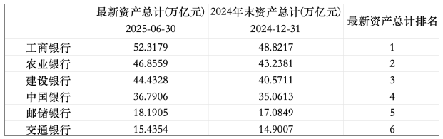 從資產規模來看,今年上半年,國有六大行資產規模均實現穩步增長。工商銀行資產規模站上52萬億元臺階,穩坐頭把交椅,農業銀行、建設銀行的資產規模均超40萬億元,分別為46.86萬億元、44.43萬億元。中國銀行、郵儲銀行、交通銀行的資產規模均較2024年末有所增長。