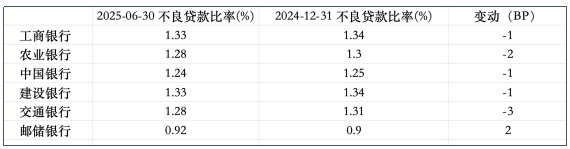 國有大行方面,資產質量整體保持穩健,不良率有所下降。工商銀行與建設銀行不良貸款率均為1.33%,較上年末均下降0.01個百分點,中國銀行不良貸款率1.24%,同樣較上年末下降0.01個百分點,交通銀行、農業銀行不良貸款率均為1.28%,其中交通銀行較上年末下降0.03個百分點,農業銀行下降0.02個百分點,郵儲銀行不良貸款率雖較上年末上升0.02個百分點,但其0.92%的不良率仍處于六大行中的最低水平。