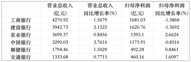 上半年,國有六大行營收均實現同比正增長,合計實現營收約1.83萬億元,合計實現歸母凈利潤約6825億元。具體來看,工商銀行實現營收4270.92億元,同比增長1.6%,營收規模穩居第一。中國銀行實現營業收入3290.03億元,以3.76%的增速成為六大行中營收增長最快的機構。建設銀行、農業銀行、郵儲銀行、交通銀行營收依次為3942.73億元、3699.37億元、1794.46億元、1333.68億元,同比增幅2.15%、0.85%、1.5%、0.77%。