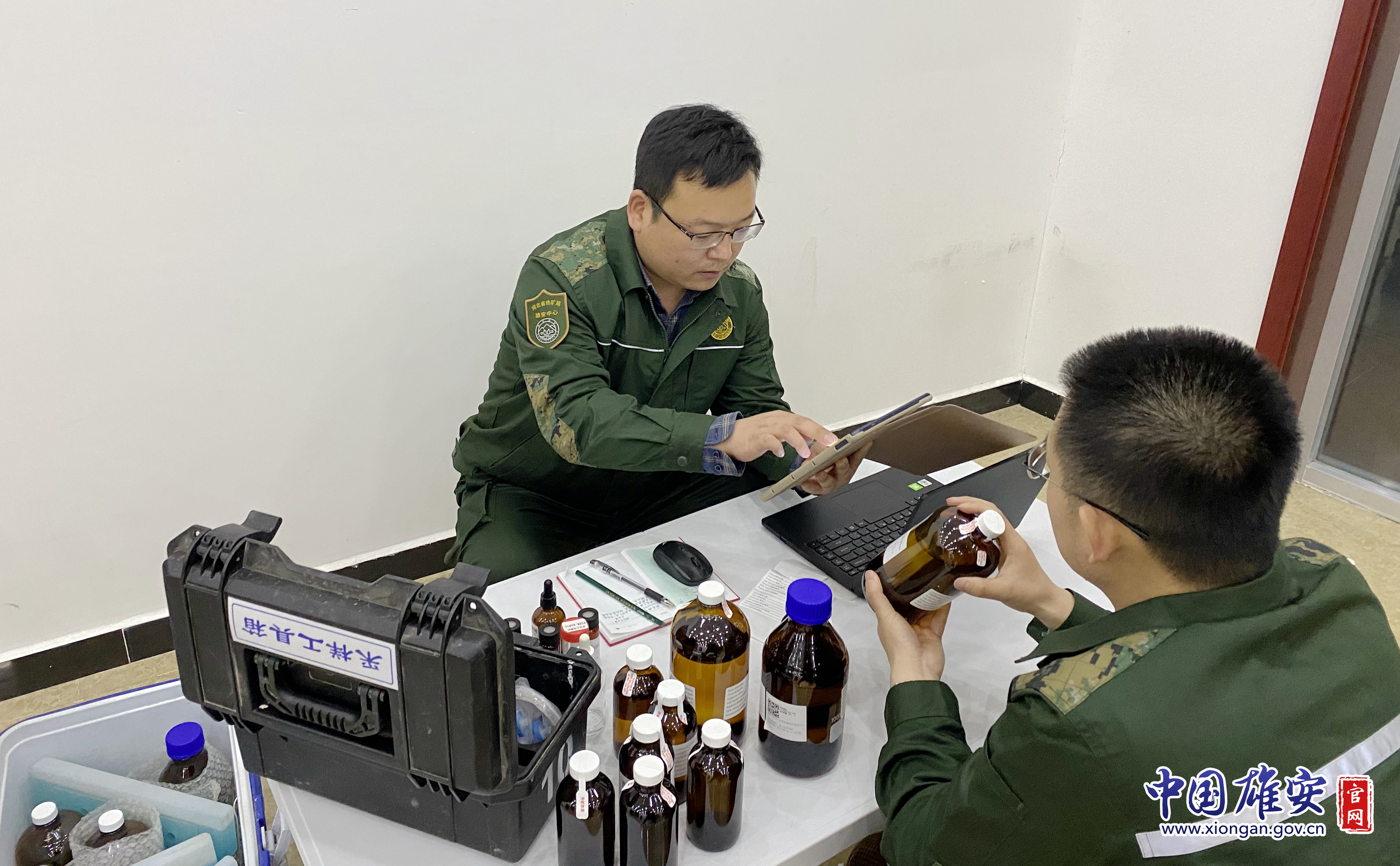 ▲王坤(左一)在進行雄安新區地下水監測樣品登記錄入工作。河北省地礦局雄安地質調查監測中心供圖