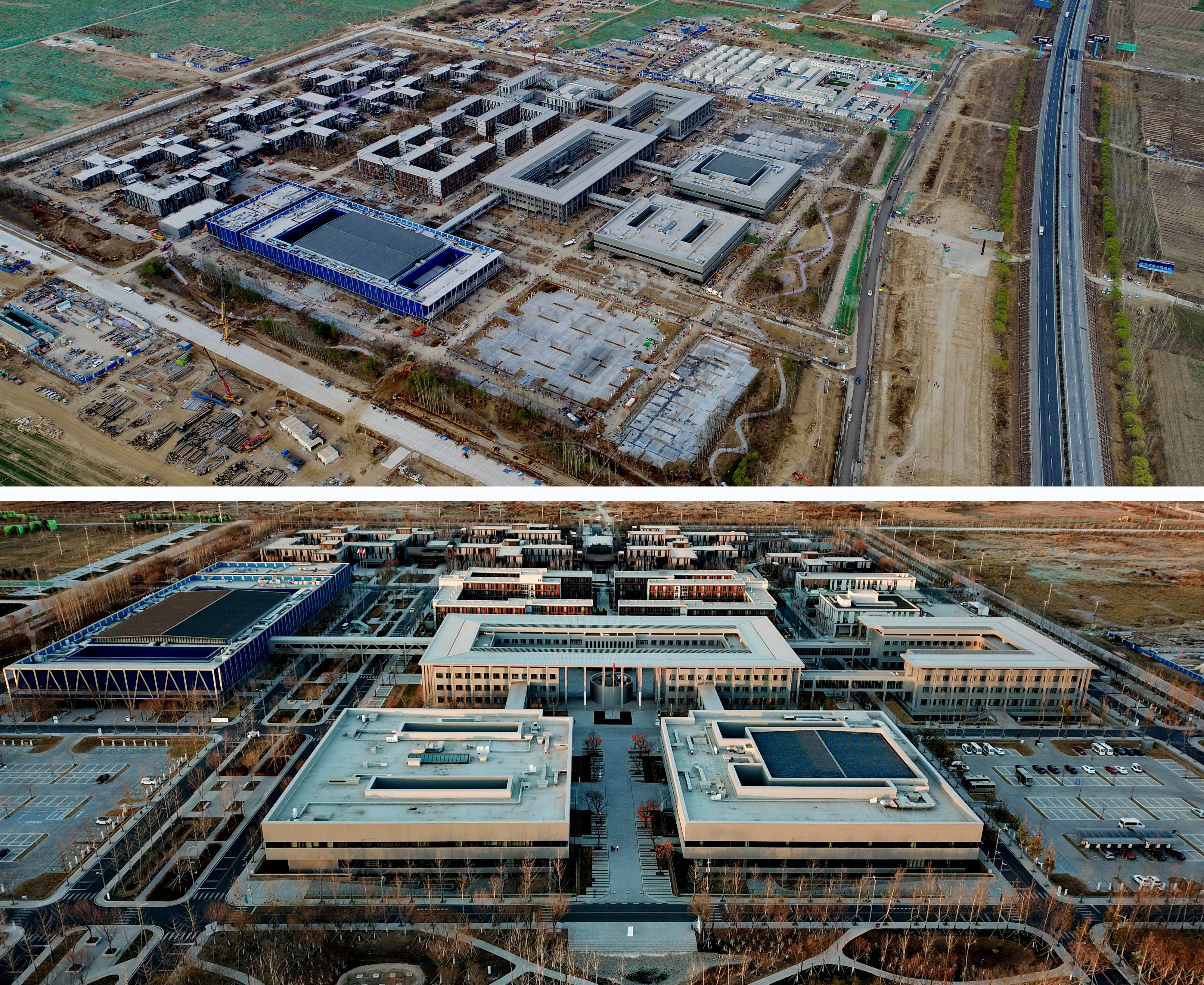 ▲上圖為2018年3月29日拍攝的正在建設中的雄安市民服務中心;下圖為2018年12月7日拍攝的竣工并已投入使用的雄安市民服務中心 新華社記者 朱旭東 攝