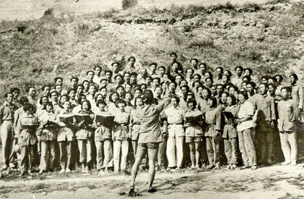 ▲1939年,冼星海指揮魯藝學員排練《黃河大合唱》(資料照片)。延安文藝紀念館提供