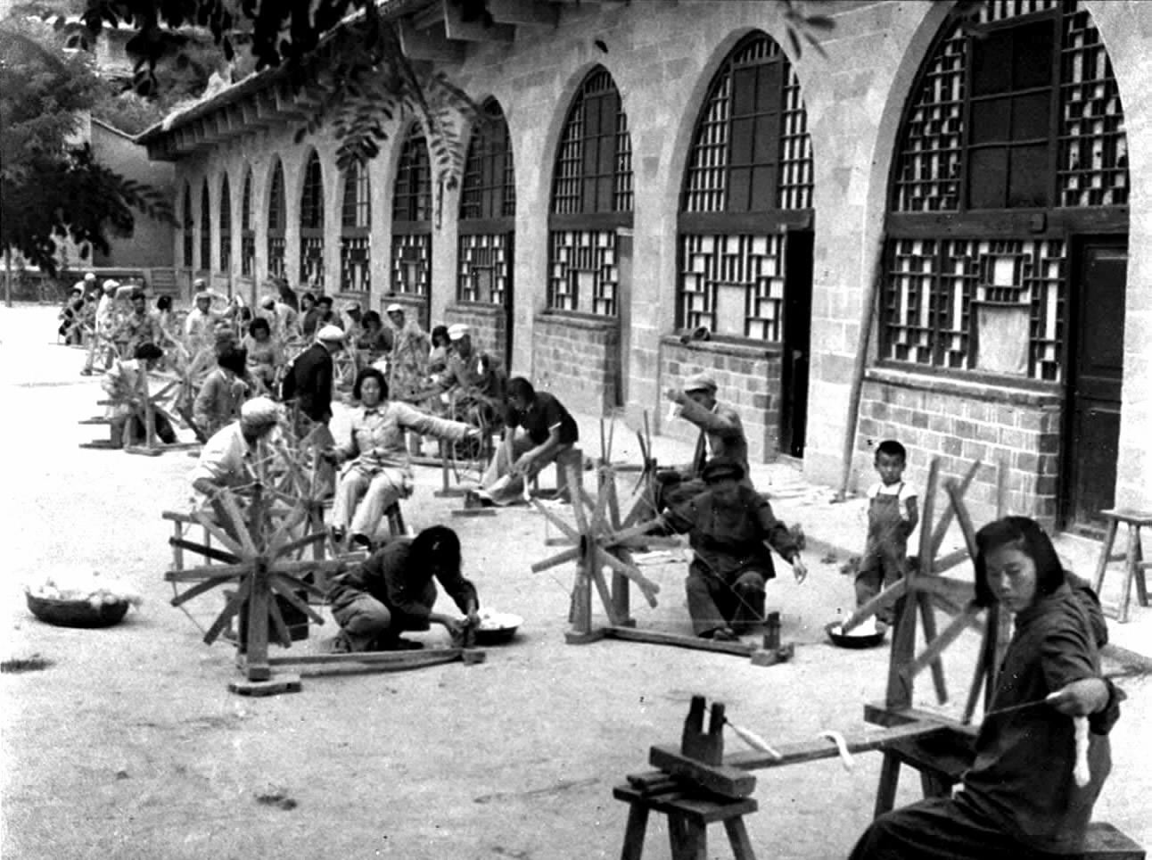 ▲延安機關干部在窯洞前搖車紡線。新華社發