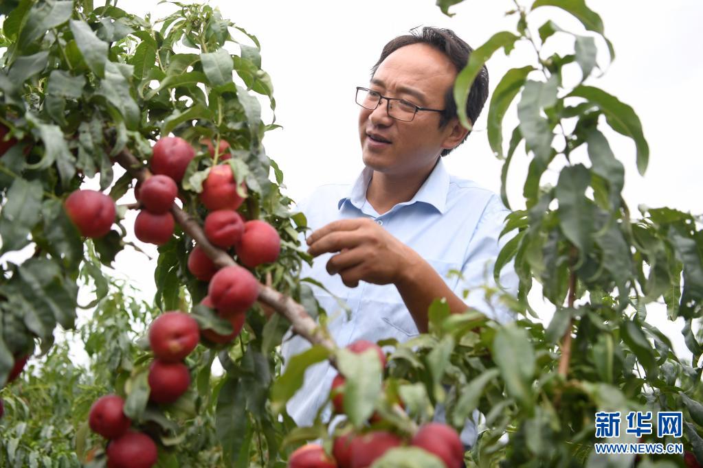 一場秋雨過后,甘肅省武威市涼州區紅水河西岸沙漠地帶的桃園里,又大又紅的桃子壓彎枝頭,香味誘人。