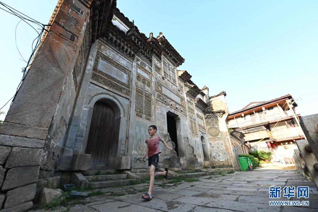 8月18日,小朋友從下梅村的鄒氏家祠前跑過。