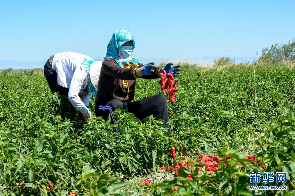 8月19日,在新疆巴里坤哈薩克自治縣三塘湖鎮的田地里,村民在采摘辣椒。