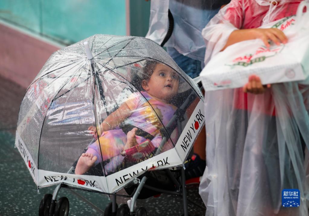 這是8月22日在美國紐約時報廣場拍攝的雨中罩在傘下的一名女孩。受熱帶風暴“亨利”影響,美國紐約當日迎來降雨天氣。新華社記者 王迎 攝