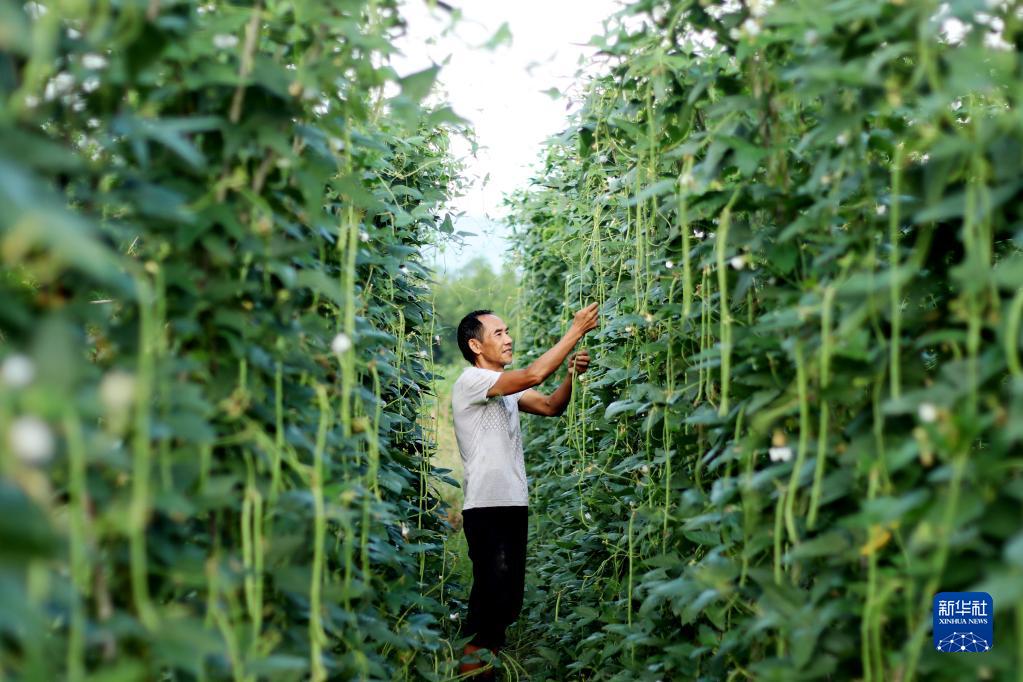 8月23日,湖南省漣源市橋頭河鎮侯勝村農民在采摘豆角。