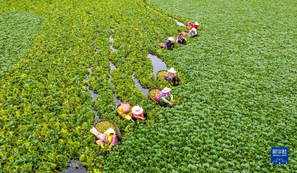 8月23日,江蘇省海安市白甸鎮周垛村村民在采摘菱角(無人機照片)。