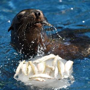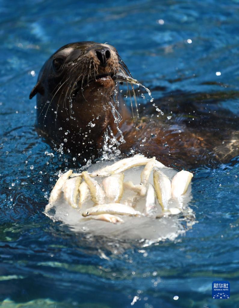 8月26日,一只海獅在意大利羅馬動物園享用冰凍食物。