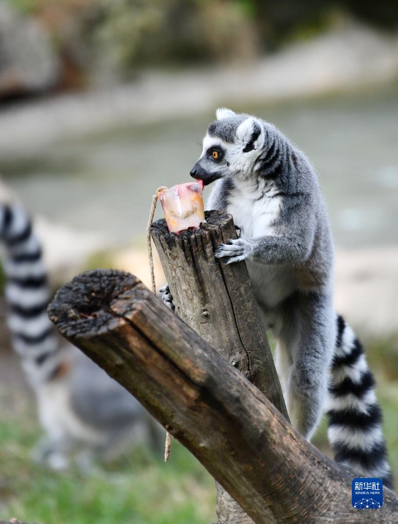 8月26日,一只環尾狐猴在意大利羅馬動物園享用冰凍果蔬。
