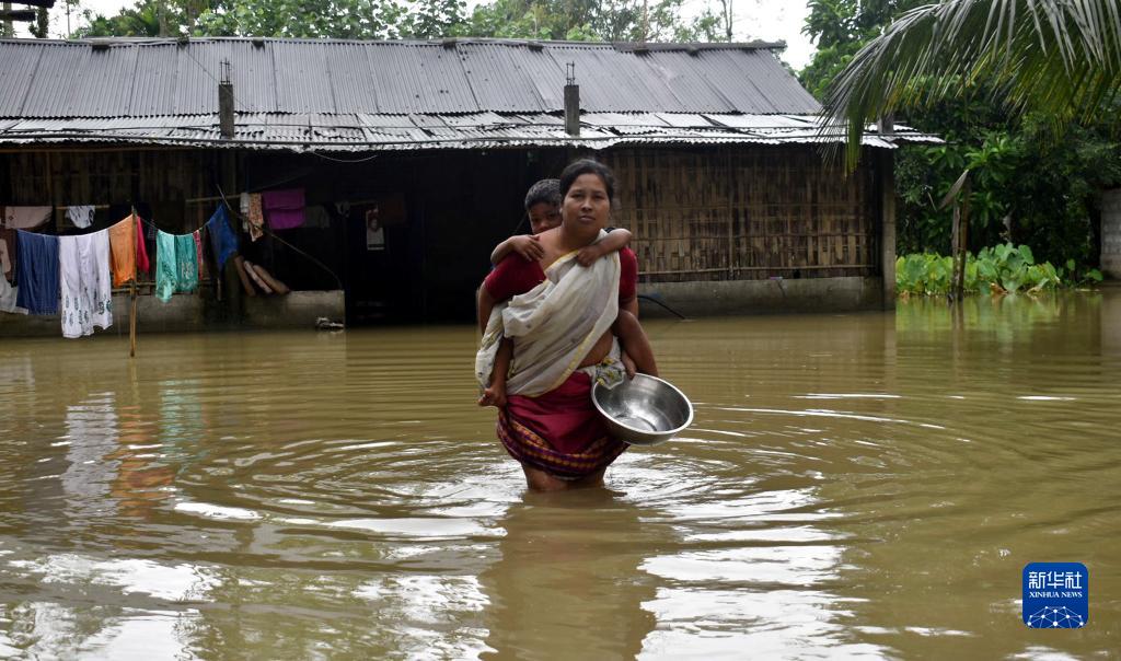 8月28日,一名女子帶著孩子在印度阿薩姆邦一村莊的洪水中行走。