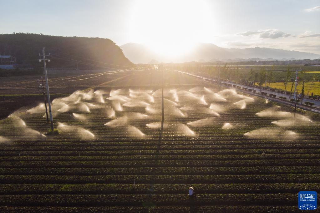 8月30日,在濂溪大洞蔬菜基地,灌溉系統在給蔬菜澆水(無人機照片)。