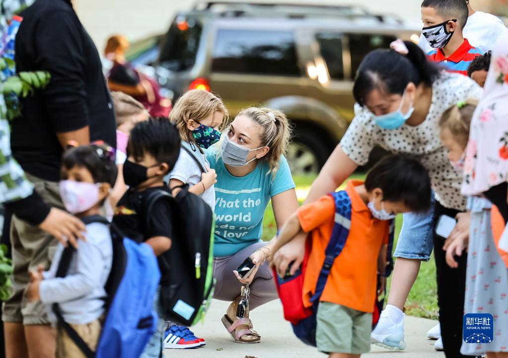 8月30日,在美國芝加哥,家長在開學日送孩子上學。