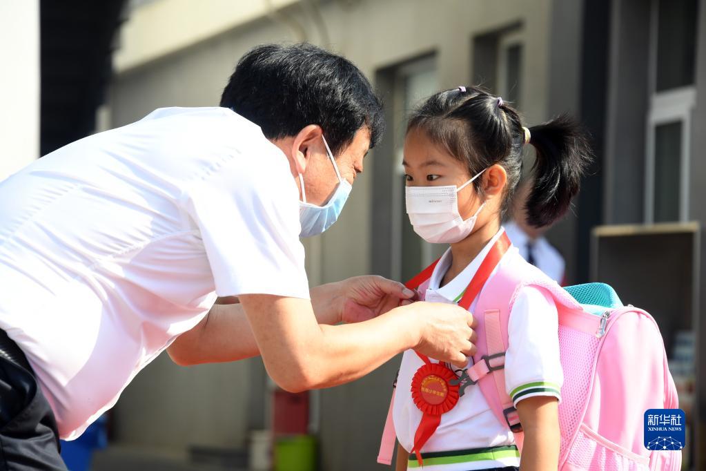 9月1日,在北京市海淀區太平路小學,老師為一年級新生佩戴“小紅花”。