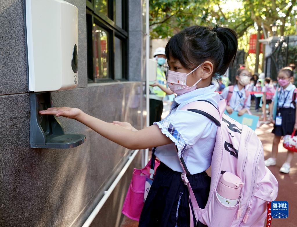 9月1日,上海市黃浦區盧灣二中心小學的學生入校后進行手部消毒。
