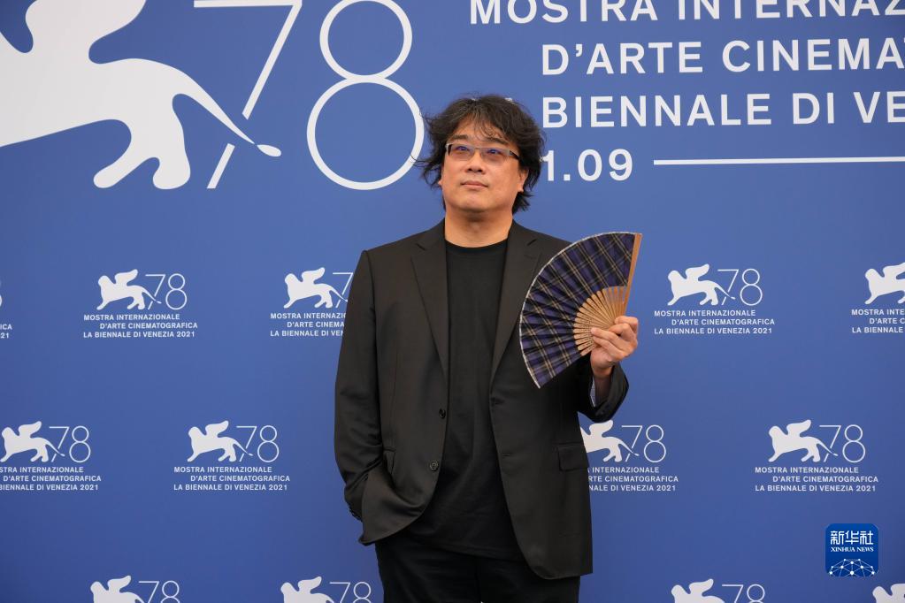 9月1日,在意大利威尼斯利多島,第78屆威尼斯國際電影節主競賽單元評委會主席奉俊昊亮相拍照式。