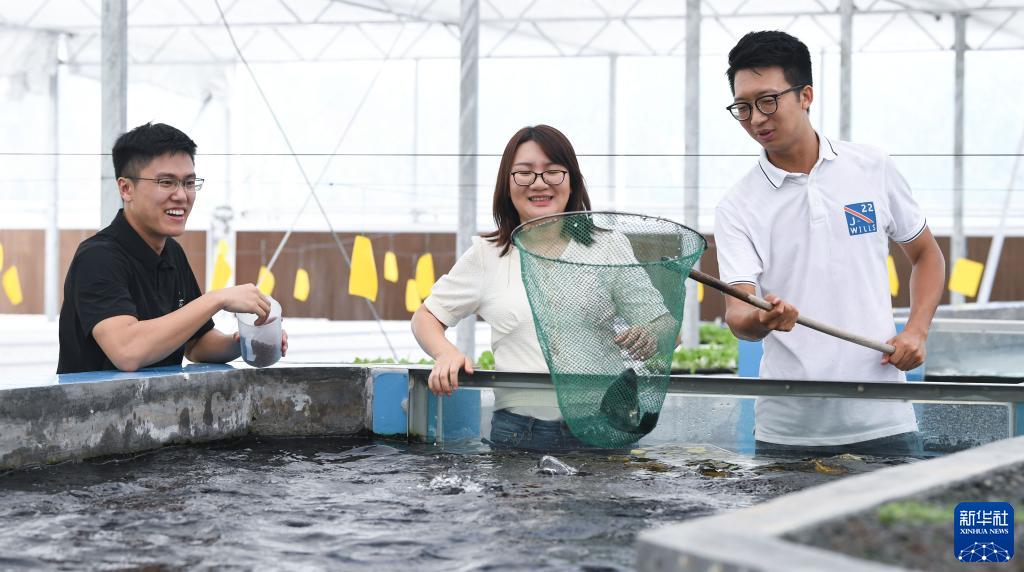 在廣東江門開平市國家現代農業示范區內,羅偉特、譚慧敏、梁立鋒(從左至右)在魚菜共生生產基地查看養殖魚類生長情況(9月2日攝)。