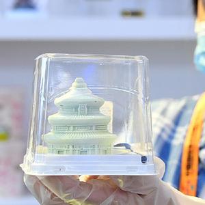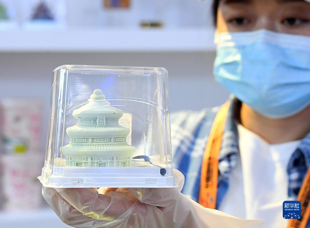 9月5日,工作人員在服貿會首鋼園區文旅服務展館展示天壇慕斯雪糕。