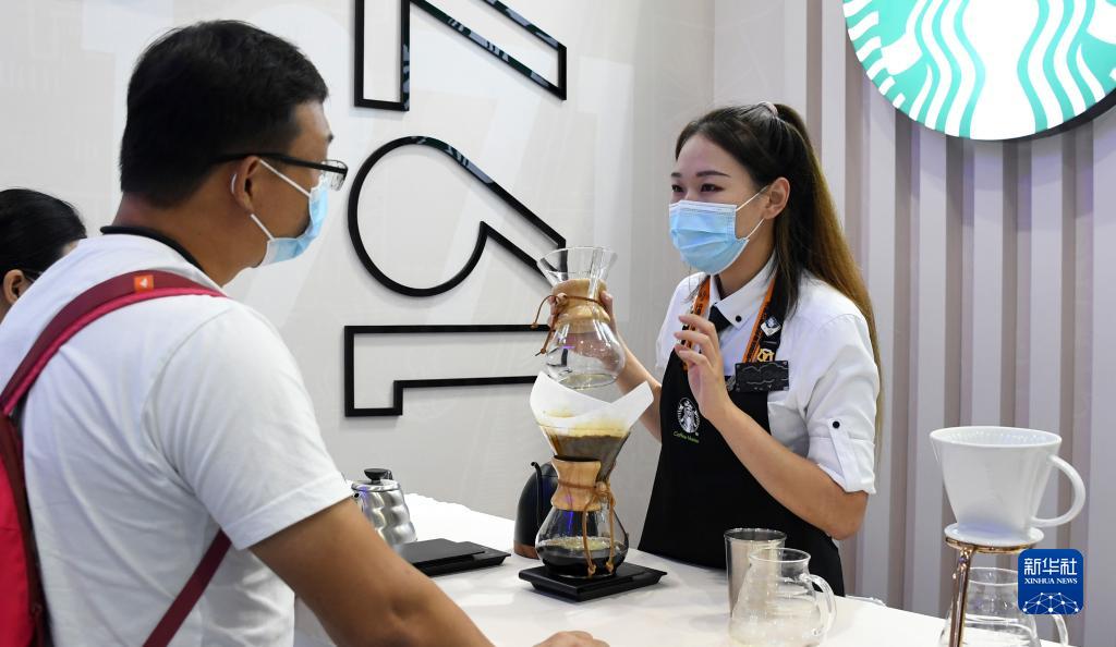9月5日,工作人員在服貿會首鋼園區供應鏈及商務服務展館向參會者介紹手沖咖啡制作流程。