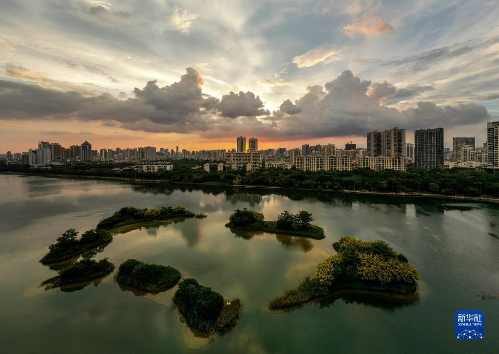 9月5日,陣雨過后,美麗晚霞映照南寧上空(無人機照片)。