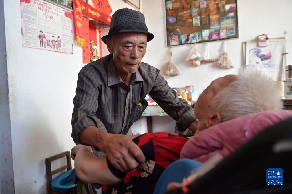 在江西省南昌縣三江鎮徐羅村,羅安民準備推老伴外出曬太陽(9月5日攝)。