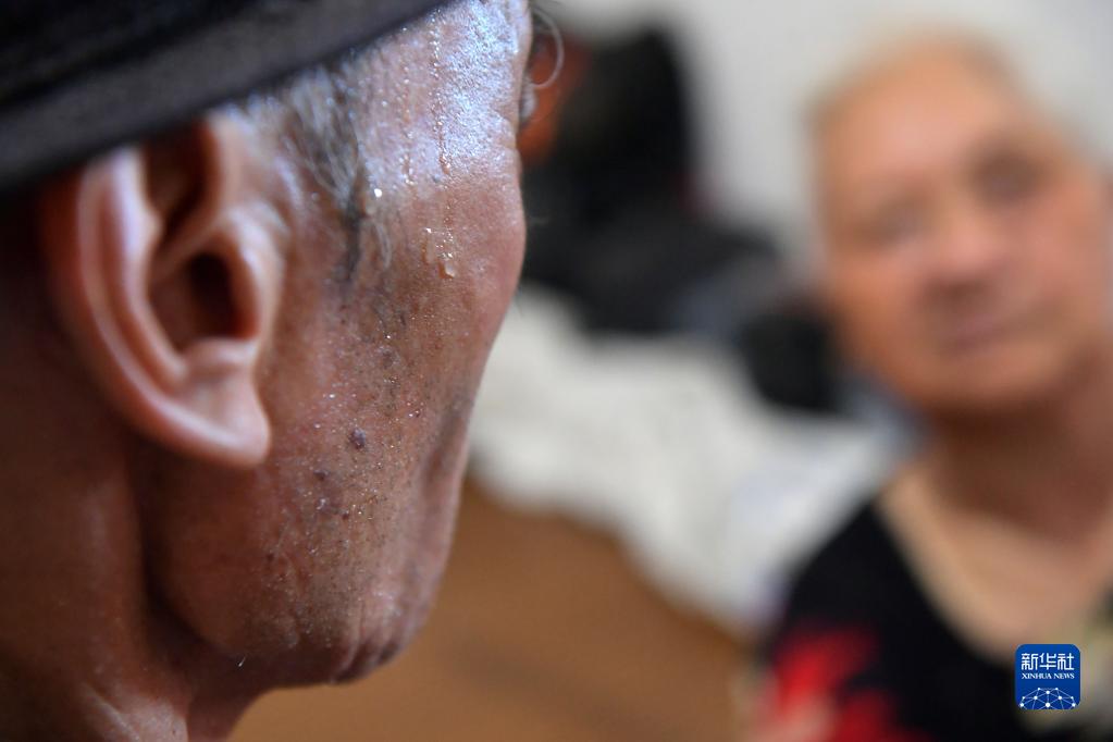 把老伴抱上輪椅后,羅安民累得滿頭大汗(9月5日攝)。