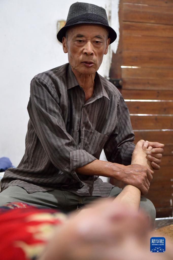 在江西省南昌縣三江鎮徐羅村,羅安民給老伴按摩(9月5日攝)。