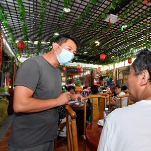 在天津市寶坻區黃莊鎮小辛碼頭村,李超(左)為客人點單(9月2日攝)。